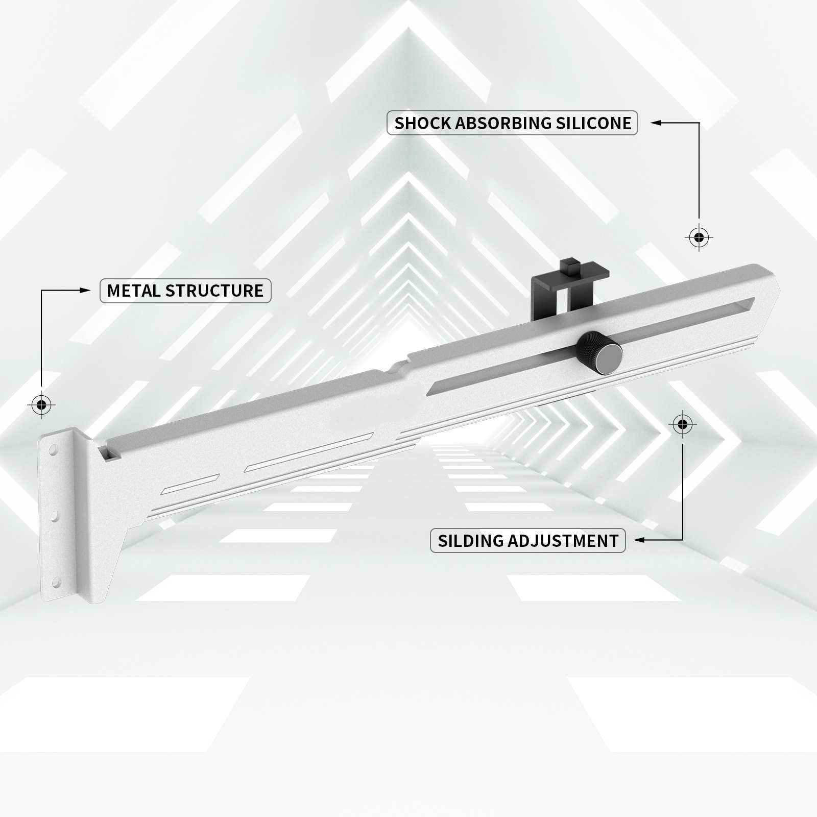 Stylová varianta této opory Vaší grafické karty je vyrobena z ocelového práškově lakovaného plechu a plastu, zabraňuje prohýbání větších karet ve slotu a dodává tak sestavě lepší celkovou stabilitu. Součástí je silikonová posuvná opora, kterou lze posunout jak horizontálně tak i vertikálně a umožňuje instalaci v různých místech karty, pro maximální kompatibilitu s většinou karet. Rozměry držáku jsou 280 x 52mm.