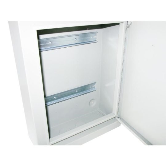 Kovový rozvaděč pro vnitřní instalace s DIN lištou. Rozvaděč je opatřen kovovým zámkem a ventilačními otvory.