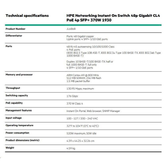 | Aruba Instant On 1930 48G Class4 PoE 4SFP/SFP+ 370W Switch (JL686B) | ||