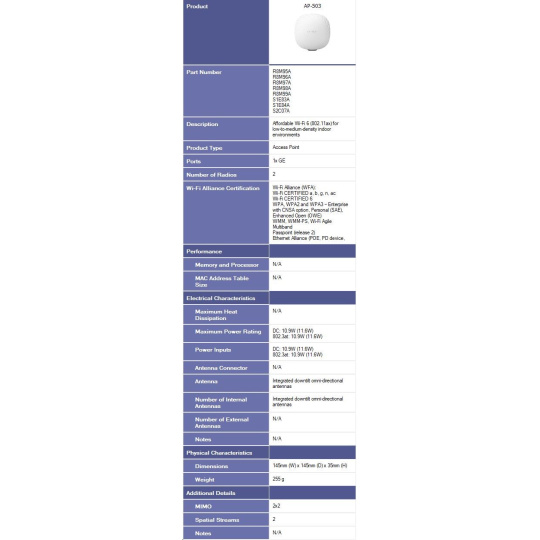 The Aruba 503 Series Access Points (APs) provide cost-effective, high-performance connectivity for any organization experiencing device growth due to increased mobility, the shift to cloud, or IoT. With a maximum real-world aggregate data rate of 1.49 Gbps (HE80/HE20), the 503 Series deliver the speed and reliability needed for medium-density venues and workplaces such as schools, midsize offices, and retailers. Each 503 Series AP provides connectivity for a maximum of 256 associated clients per radio (512 in total).