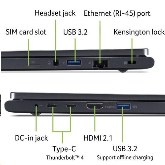 2x USB Type-C port USB 3.2 Gen2 (up to 10 Gbps) / Display port over USB-C / Thunderbolt 4 / USB charging 5 V; 3 A / DC-in port 20 V; 65 W with USB Type-C docking support