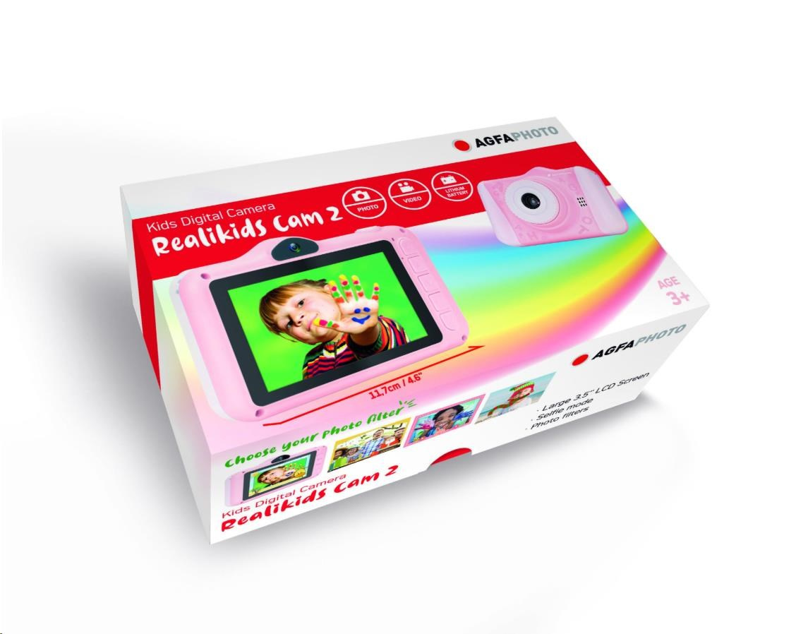 Realikids Cam 2 je ideální digitální fotoaparát pro děti. Jeho CMOS snímač umožňuje pořizovat nádherné fotografie a videa v HD. Má 3,5" LCD displej, na kterém si můžete prohlédnout vaše fotografie. Má také port pro micro SD karty až do 32 GB (není součástí dodávky). Jeho zábavný a ergonomický design zaručuje dokonalé uchopení a potěší každého malého fotografa.
