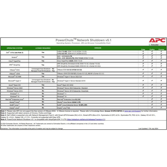 Licence pro síťové vypnutí PowerChute na 1 rok. Licenční období je zahájeno aktivací licence koncovým uživatelem. Jednoduchá integrace se všemi dodavateli virtualizací a HCI. V případě výpadku napájení umožňuje APC UPS hladké vypnutí soustavy zařízení.