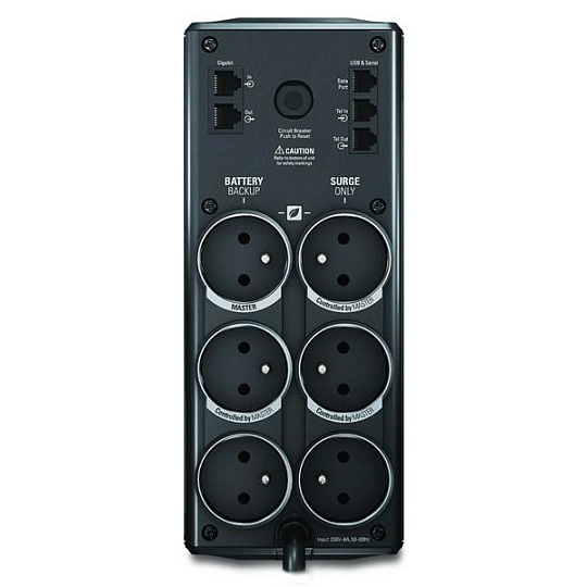 | Typ zásuvek | RJ-11 In/Out RJ45 Base-T Ethernet (3) French/Belgian (výstup - Záložní provoz na baterie) (3) French/Belgian (výstup - Přepěťová ochrana) pro ochranu laserových tiskáren, scannerů, či jiných zařízení s velkým odběrem |