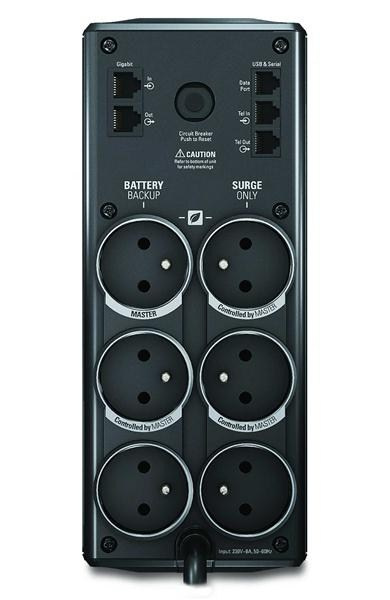 | Typ zásuvek | RJ-11 In/Out RJ45 Base-T Ethernet (3) French/Belgian (výstup - Záložní provoz na baterie) (3) French/Belgian (výstup - Přepěťová ochrana) pro ochranu laserových tiskáren, scannerů, či jiných zařízení s velkým odběrem |