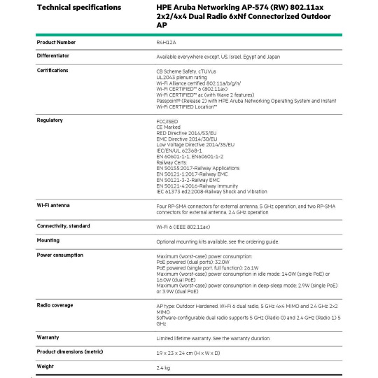 Aruba AP-574 (RW) 802.11ax 2x2:2/4x4:4 Dual Radio 6xNf Connectorized Outdoor AP R4H12A RENEW