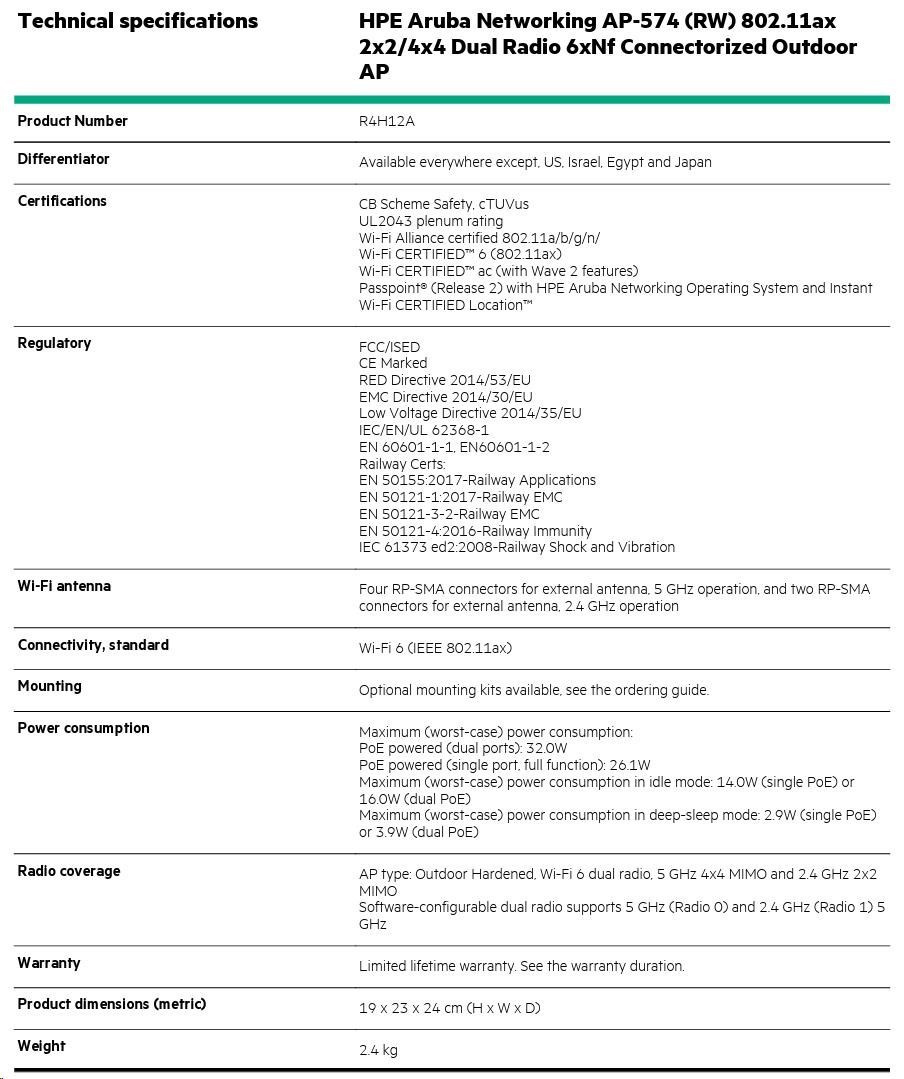 Aruba AP-574 (RW) 802.11ax 2x2:2/4x4:4 Dual Radio 6xNf Connectorized Outdoor AP R4H12A RENEW