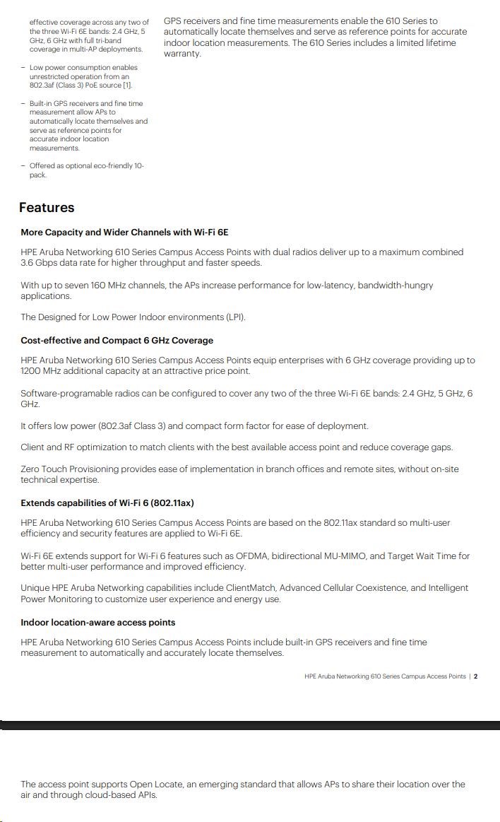 Aruba 610 Series Access Points are designed to take advantage of the 6 GHz band using two radios that can deliver comprehensive tri-band coverage in a multi-AP environment and better meet the growing demands of Wi-Fi due to increased use of video, growth in client and IoT devices, and expanded use of cloud. With a 3.6 Gbps combined peak data rate for higher throughput and faster speeds for indoor use, the Aruba 610 Series delivers a cost-effective enterprise Wi-Fi 6E solution with increased capacity, wider channels, reduced power consumption.