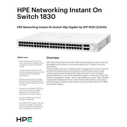| Aruba Instant On 1830 8G Switch (JL810A) | Aruba Instant On 1830 8G 4p Class4 PoE 65W Switch (JL811A) | Aruba Instant On 1830 24G 2SFP Switch (JL812A) | Aruba Instant On 1830 24G 12p Class4 PoE 2SFP 195W Switch (JL813A) | Aruba Instant On 1830 48G 4SFP Switch (JL814A) | Aruba Instant On 1830 48G 24p Class4 PoE 4SFP 370W Switch (JL815A) | ||||||||