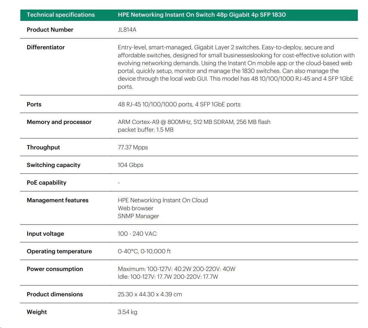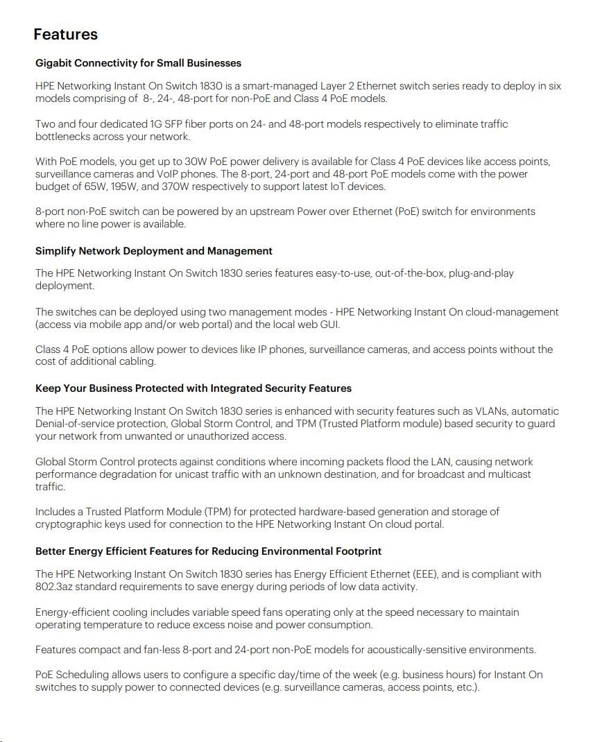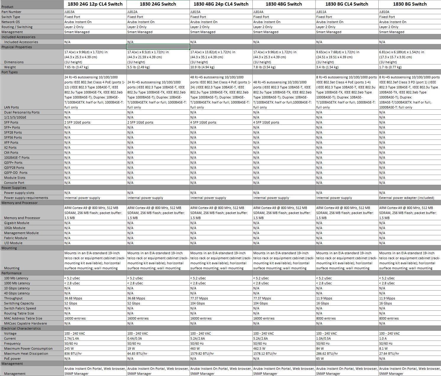 Aruba Instant On 1830 8G Switch (JL810A) | Aruba Instant On 1830 8G 4p Class4 PoE 65W Switch (JL811A) | Aruba Instant On 1830 24G 2SFP Switch (JL812A) | Aruba Instant On 1830 24G 12p Class4 PoE 2SFP 195W Switch (JL813A) | Aruba Instant On 1830 48G 4SFP Switch (JL814A) | Aruba Instant On 1830 48G 24p Class4 PoE 4SFP 370W Switch (JL815A) | ||||