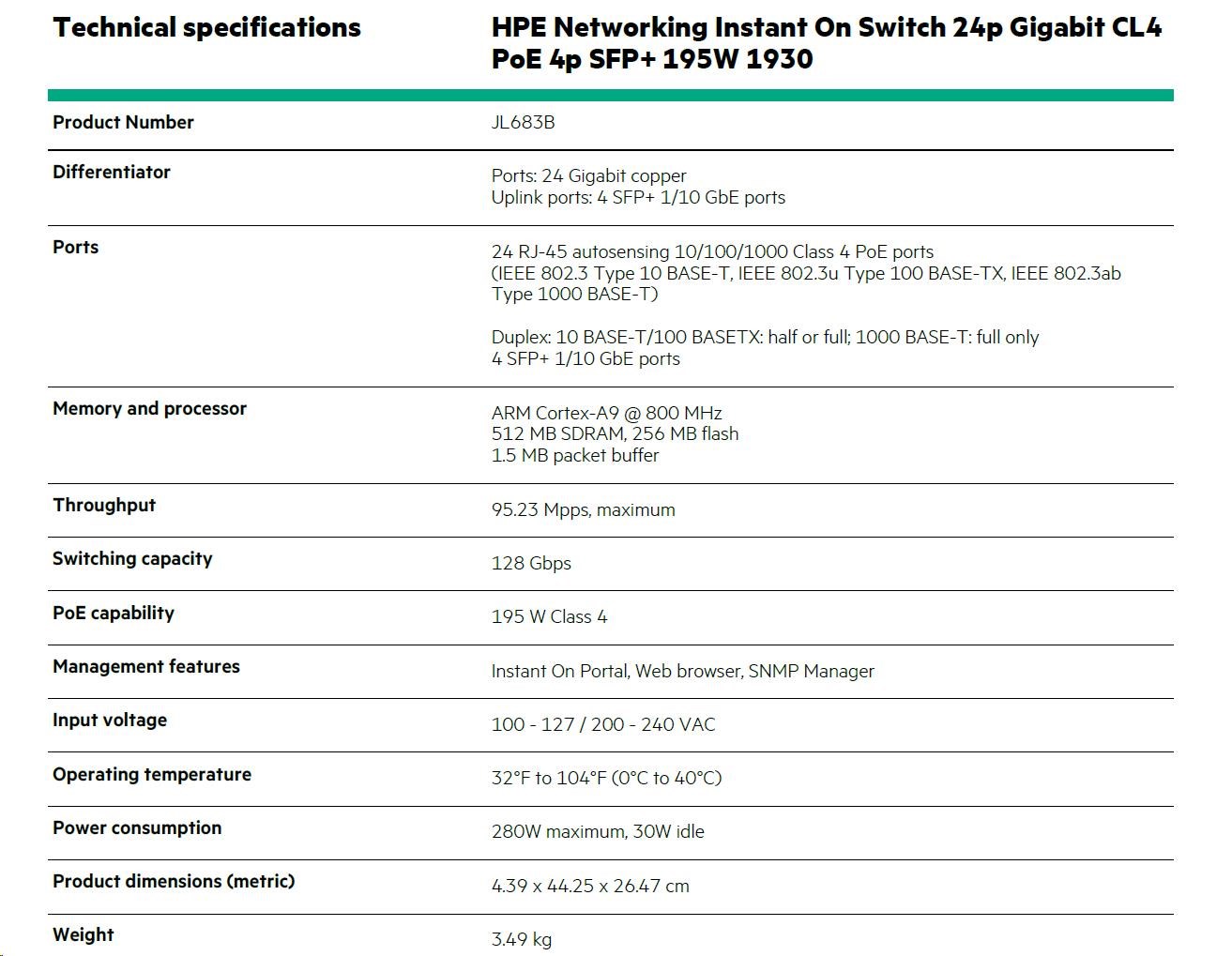 HPE Networking Instant On Switch 24p Gigabit CL4 PoE 4p SFP+ 195W 1930 (JL683B)
