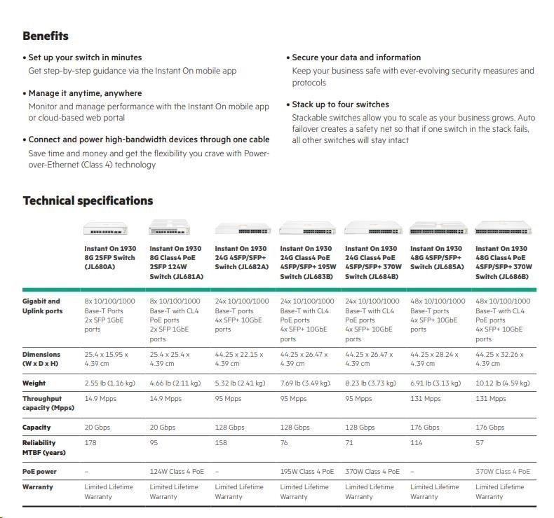 | The Instant On Differentiators Easy Setup and Management The Aruba Instant On mobile app allows you to set up, manage, and monitor Instant On switches and access points directly from your phone. Within the app, you get guided step-by-step instructions to install Instant On devices to get your network up and running quickly - no technical expertise required. And cloud-based access allows you to access the network from anywhere, at any time. Non-intrusive, Aesthetic Design Aruba Instant On switches are designed to complement the sleek and clean look of the Instant On access points, and to blend discreetly into your site's environment. The 8-port models, as well as the 24- and 48-port non PoE models, are fan-less, making them ideal for quiet office deployments. High Performance with Flexible Options The series consists of four (4) Class 4 PoE switches, and three (3) non-PoE switches including 8- 24- and 48-port Gigabit Ethernet switches. The two (2) dedicated 1G SFP fiber ports on 8-port models, and four (4) dedicated 1G/10G SFP+ fiber ports on 24-/48-port models, ensure high performance and eliminate traffic bottlenecks across the network. Customizable features include basic Layer 2 features like VLANs and link aggregation, as well as advanced features such as Layer 3 IPv4 static routing, ACLs, and Spanning Tree Protocols, and IPv6 Host mode. Optimized User Experience The Aruba Instant On mobile app provides common workflows for Instant On switches and access points making it easier to configure, monitor and manage your network remotely without the need for additional hardware like cloud keys or VPN. You can also update firmware on your Instant On devices directly from the cloud whenever you want, from wherever you are. Site inventory The site inventory feature on the Instant On mobile app shows you all switches and AP's on a single screen, allowing you to quickly identify non-functioning devices and troubleshoot accordingly. Multi-Site Management The cloud-hosted web interface and mobile app make it easy to manage multiple sites, multiple networks, distributed deployments and multi-tenant deployments. Each site is logically separated and has its own configuration, statistics, guest portal, and admin read/write privileges. Built-In Security Built-in security features protect your network from external threats by blocking malware attacks and keeping unauthorized users off the network. Network traffic can be filtered and access restricted based on MAC and IP address. No Hidden Fees All features are included in the price of the hardware - there are no recurring subscription or licensing fees. Expert-level support and industry leading limited lifetime warranty are also included, along with chat support for the life of the product. |