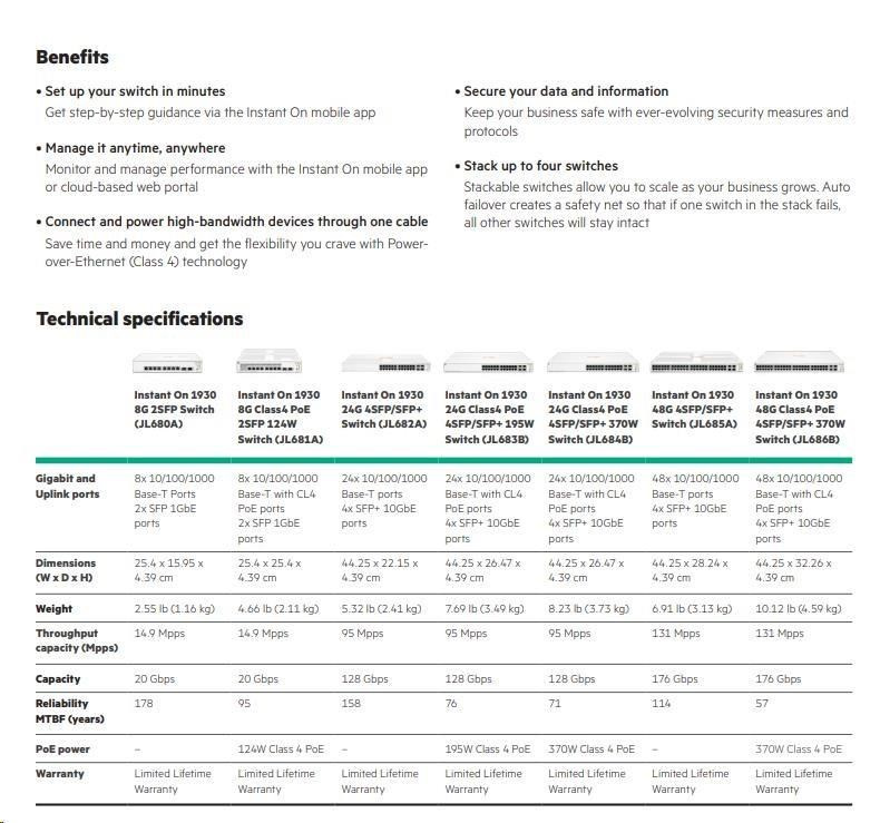 | High-Performance, Smart-Managed Switches Designed with Small Businesses in Mind Whether you own a cafe, a design firm or a tech startup, a reliable and secure network plays a critical role in the success of your business. And you need a network solution that gives you peace of mind, allowing you to focus on growing your business instead of managing problems with your network. Aruba Instant On makes it easy to keep network users happy, mobile and IoT devices connected, and your network secure. The Aruba Instant On 1930 switches features advanced, smart-managed, fixed- configuration Gigabit switches designed for small businesses that are easy-to-deploy and affordable. They're made to handle today's bandwidth-heavy applications like voice and video conferencing, enabling consistent connectivity to enhance performance. Using either the Instant On mobile app or the cloud-based web portal, you can quickly set up, monitor and manage the 1930 switch series from anywhere at any time. What's more, up to 30 W PoE power delivery is available out-of-the-box for your class 4 PoE devices, like access points, surveillance cameras and VoIP phones, all easily managed from the same platform. Built-in security features protect your network from unauthorized access by allowing you to segment traffic and define access to each area of the network. And all of this is included in the price of the hardware - there are no hidden subscription or licensing fees. |