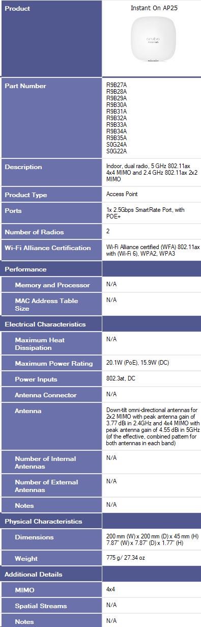 Ultra-high-speed performance for high-density small businesses. Perfect for gaming, boutique hotels, tech start-ups and professional offices. The rise of the remote and hybrid workplace has placed increased pressure on business networks. Existing Wi-Fi infrastructure is struggling to support the explosion of devices and bandwidthhungry applications - all contributing to spotty video calls and sluggish download speeds. The Aruba Instant On AP25, a 4x4 Wi-Fi 6 access point, is designed to meet the increasing volume of connected devices. Delivering superior performance, coverage, and speed at a competitive price, the AP25 is the perfect access point for small and growing businesses. The Wi-Fi Certified 6TM AP25 delivers faster Wi-Fi speeds, greater capacity, and reduced latency between access points and devices for a superior Wi-Fi experience. AP25 improves efficiency and reduces congestion for networks with many connected devices, making it ideal for high-density environments. And with 4x the capacity of 802.11ac access points, the AP25 provides exceptional user experience, allowing businesses to serve more customers with higher speed and less congestion. Features of the AP25 include orthogonal frequency-division multiple access (OFDMA), multi-user MIMO and target wake time (TWT). With up to 4 spatial streams (4SS) and 160MHz channel bandwidth (HE160), the AP25 provides groundbreaking wireless capabilities for businesses looking to boost performance and future-proof their networks. |