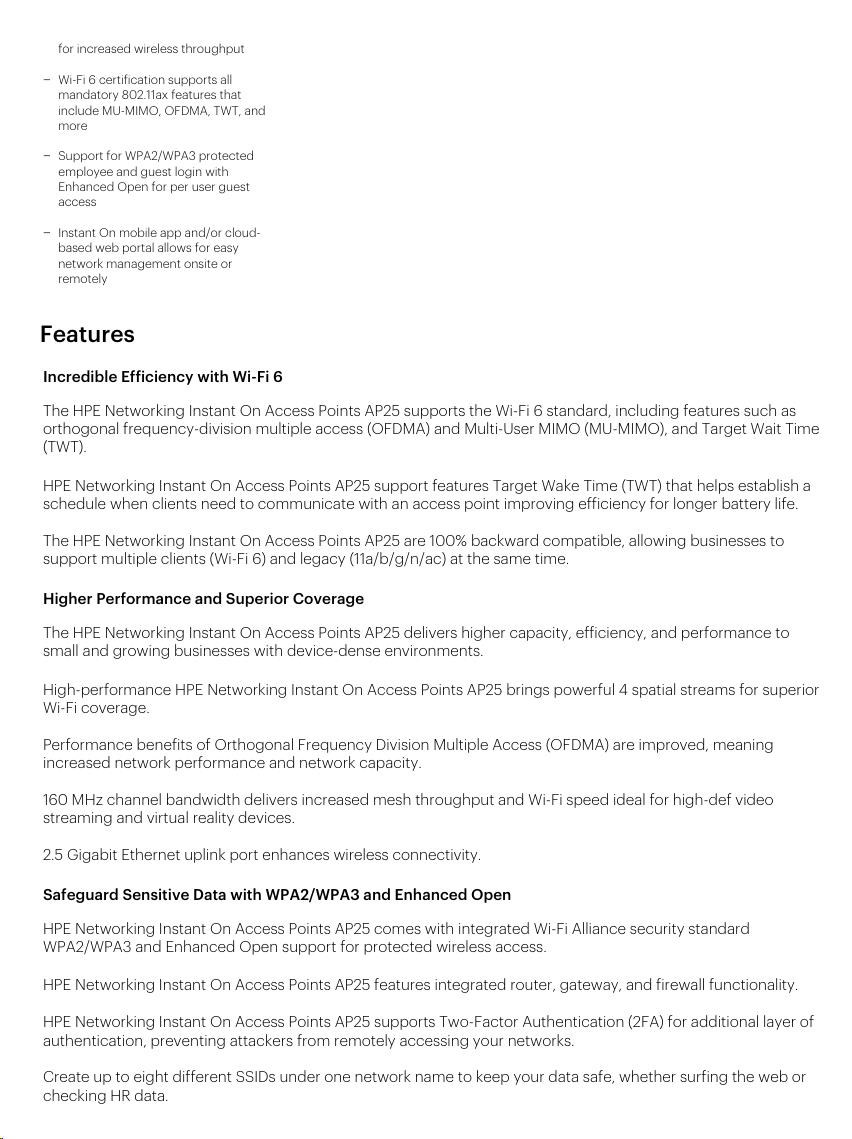 Multiuser, Multiple Input, Multiple Output (MU-MIMO) AP25 supports MIMO, allowing service to multiple clients (Wi-Fi 5 and Wi-Fi 6) at the same time. 1024-Quadrature Amplitude Modulation (1024-QAM) Enables a 25% data increase over 256 QAM, improving throughput to access points and devices. Trusted Platform Module (TPM) All Aruba Instant On access points have an installed TPM for secure storage of credentials, keys, and boot codes. Basic Service Set Coloring (BSS Coloring) Allows the network to assign a "color" tag to a channel and reduce the threshold for interference. Network performance is improved because APs on the same channel can be closer together and still transmit at the same time. Aruba Advanced Cellular Coexistence (ACC) Uses built-in filtering to automatically minimize the impact of interference from cellular networks, distributed antenna systems (DAS), and commercial small-cell or femtocell equipment. Low Density Parity Check (LDPC) Delivers high-efficiency error correction for increased throughput. Transmit Beamforming (TXBF) Delivers increased signal reliability and range. |