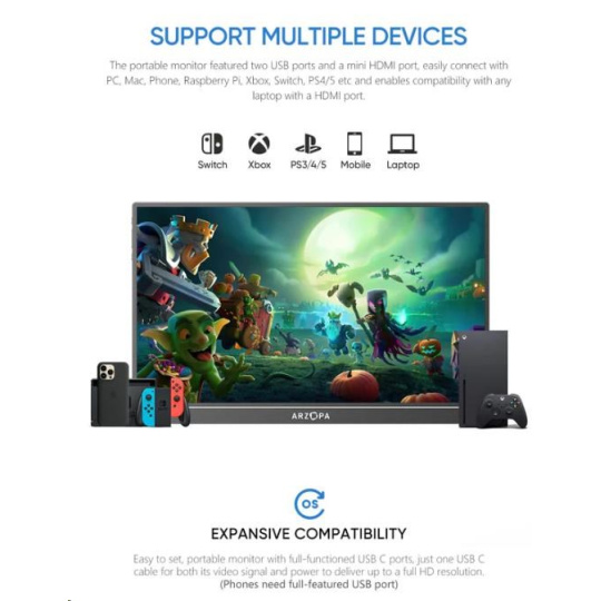 Arzopa Z1C funguje s celou řadou zařízení - od notebooků a smartphonů až po konzole (Xbox, Switch, PS4/5) a Raspberry Pi. Díky tomu je monitor vhodný pro různé aplikace - od kancelářské práce přes studium až po zábavu.