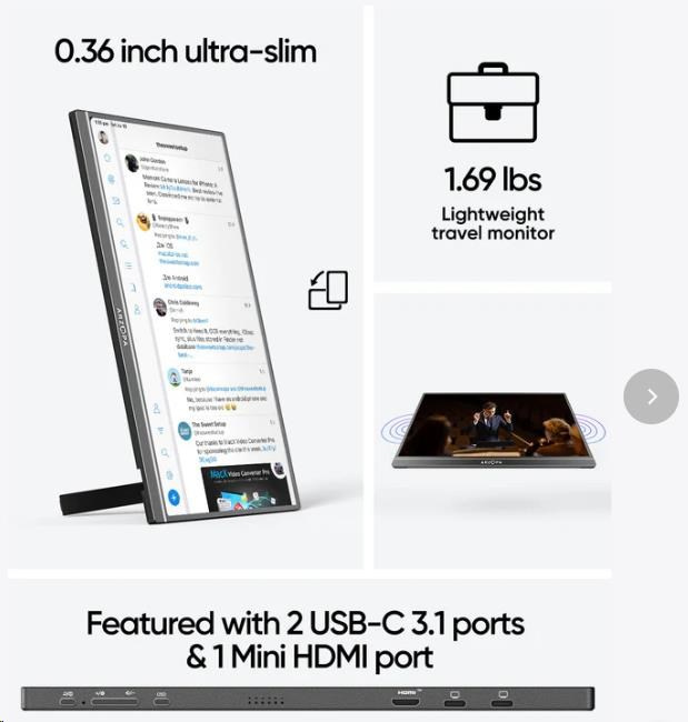 Přenosný monitor Arzopa Z1C 16,1'' je vhodnou volbou pro lidi, kteří potřebují další obrazovku - doma, na služebních cestách nebo při studiu na dálku. Díky kompaktním rozměrům a tenkému provedení se snadno vejde do brašny na notebook a jeho lehká konstrukce (780 g) nezatíží vaše zavazadla. Je dobrou volbou, pokud chcete rozšířit svůj pracovní prostor, aniž by zabíral mnoho místa.