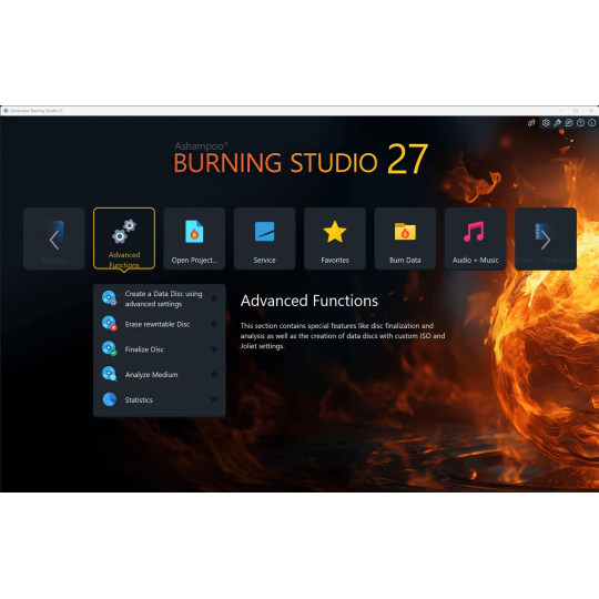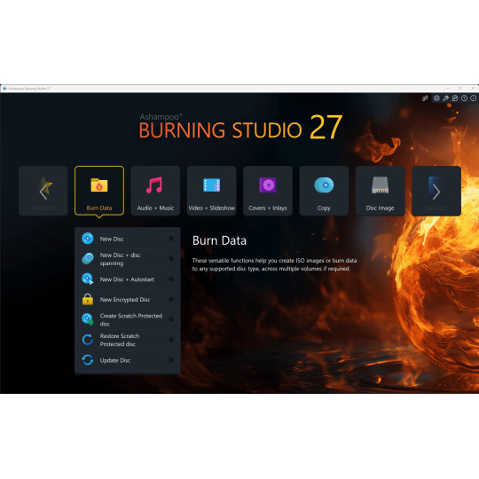 Nové Ashampoo Burning Studio 27 představuje nejpohodlnější způsob, jak bezpečně vypálit data a bez námahy kopírovat disky CD, DVD a Blu-ray. Ripujte zvukové disky a zálohujte hudbu nebo si vytvářejte vlastní hudební kompilace s vhodným obalem! Další špičkové multimediální funkce vám také umožňují vytvářet vlastní filmy a prezentace a dokonce je vypalovat na disk spolu s elegantními animovanými nabídkami. Rozlučte se se ztrátou dat, okamžitě zálohujte soubory a zapisujte důležitá data na jakýkoli typ disku s výkonnou kompresí a ochranou heslem. A nové funkce pro pohodlné používání audioknih, audiopřehrávání a podcastů zaručují vysoce kvalitní zábavu!