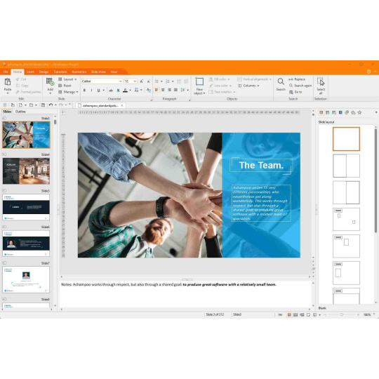 Díky snadnému ovládání a intuitivnímu designu uživatelského rozhraní je aplikace Present vhodnou náhradou aplikace PowerPoint. Verze 9 obsahuje univerzální dynamické přechody mezi snímky, které jsou skvěle kompatibilní s aplikací PowerPoint! Nyní vaše prezentace fungují i v systému Linux, a to včetně zvuků a videí. Na pásu Tabulka je nyní k dispozici prvek pro otáčení buněk tabulky a celoobrazovkový režim je všestrannější díky přepínatelným pravítkům. Vytvářejte úžasné a informativní prezentace bez námahy a užívejte si skvělou kompatibilitu s aplikací MS PowerPoint!