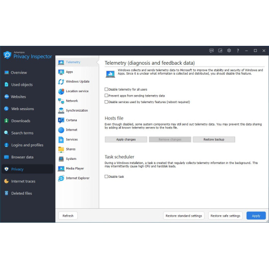 Ashampoo Privacy Inspector obsahuje vše, co potřebujete k omezení nadměrného shromažďování dat systémem Windows. Vypněte telemetrii a polohové služby, vypněte synchronizaci hesel a vypněte Cortanu. A v případě, že používáte tablet, abyste mohli se systémem Windows používat rukopis, možná vás bude zajímat, že systém Windows také odesílá vzorky vašeho rukopisu, takže nezapomeňte vypnout i tuto funkci! Zabere to jen několik kliknutí.