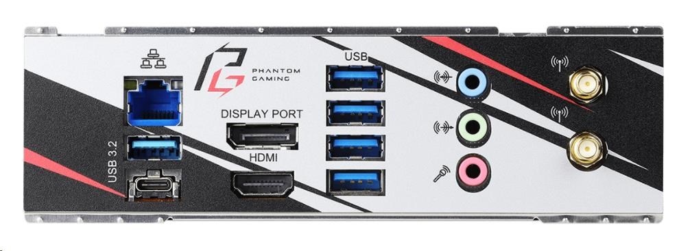 | Rear panel I/O | - 2 x Antenna Ports - 1 x HDMI Port - 1 x DisplayPort 1.4 - 1 x USB 3.2 Gen2 Type-A Port (10 Gb/s) (Supports ESD Protection) - 1 x USB 3.2 Gen2 Type-C Port (10 Gb/s) (Supports ESD Protection) - 4 x USB 3.2 Gen1 Ports (Supports ESD Protection) - 1 x RJ-45 LAN Port with LED (ACT/LINK LED and SPEED LED) - HD Audio Jacks: Line in / Front Speaker / Microphone |