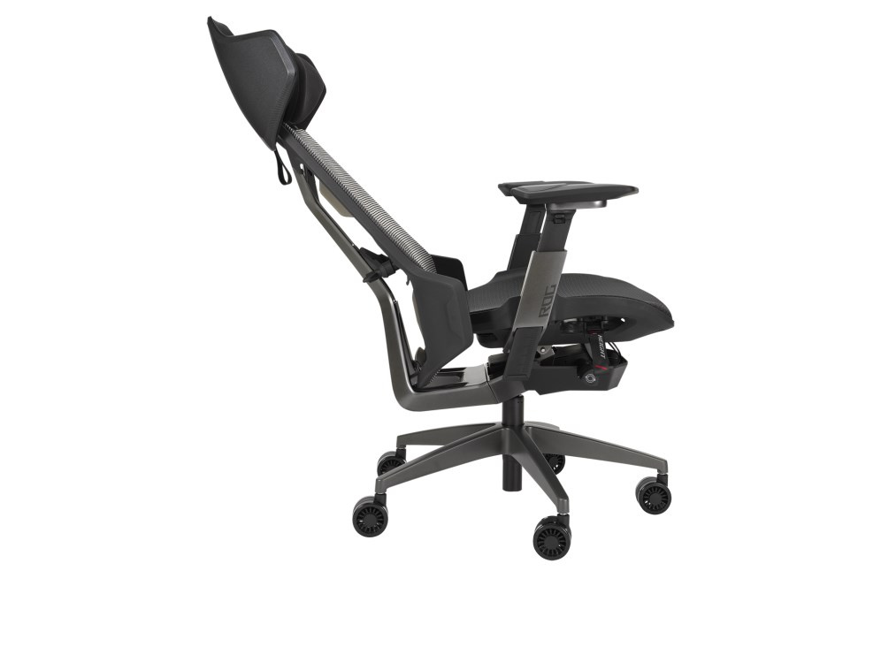 ROG Destrier Ergo Gaming Chair with futuristic cyborg aesthetic, versatile seat adjustments for the perfect posture, mobile gaming arm support mode, and acoustic panel for less distraction and more immersive gaming experience.