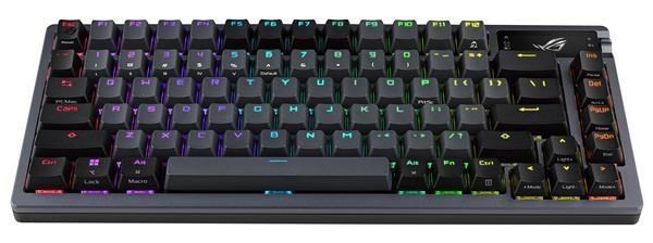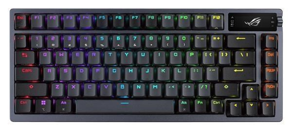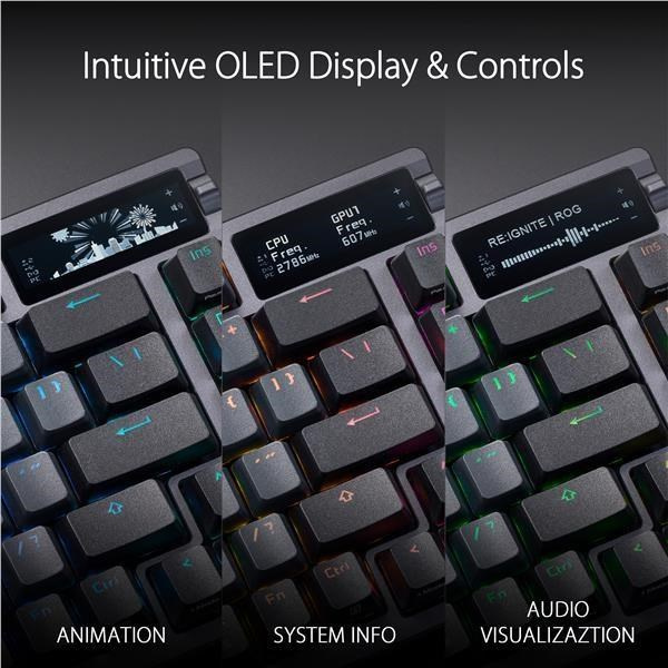 Zakázková herní klávesnice ROG Azoth s tvarovým faktorem klávesnice 75, těsněním, třívrstvou tlumicí pěnou a kovovým horním krytem, vysoce přizpůsobitelná s předem namazanými mechanickými spínači ROG NX vyměnitelnými za provozu, stabilizátory klávesnice ROG, kryty kláves PBT doubleshot a mazací sadou, tri - připojení režimu s 2,4 GHz technologií SpeedNova, OLED displejem, třícestným ovládacím knoflíkem, třemi úhly náklonu a podporou Mac