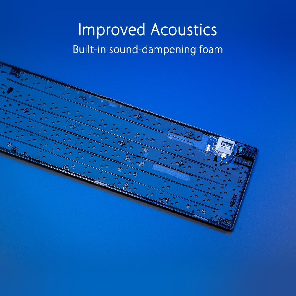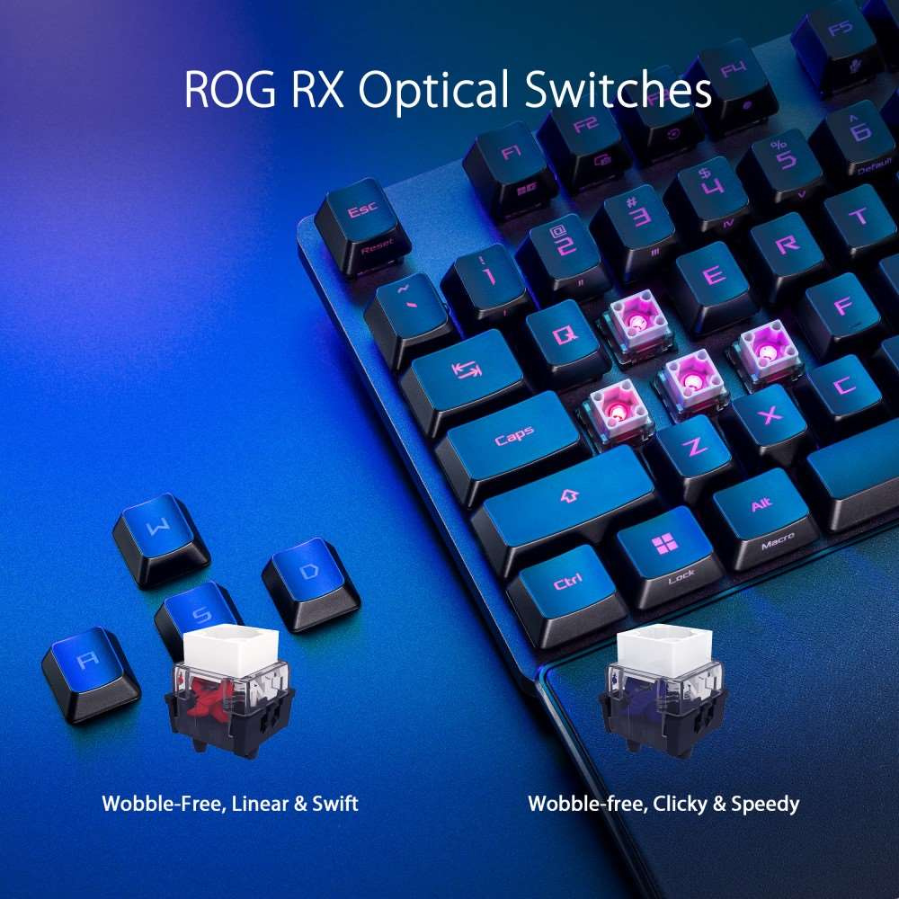 - Mechanické spínače ROG NX Red: Předem namazané lineární spínače NX Snow a klikové spínače ROG NX Storm se stěnovým designem stopky pro zvýšení stability úhozu a vyladěné pro skvělou akustiku