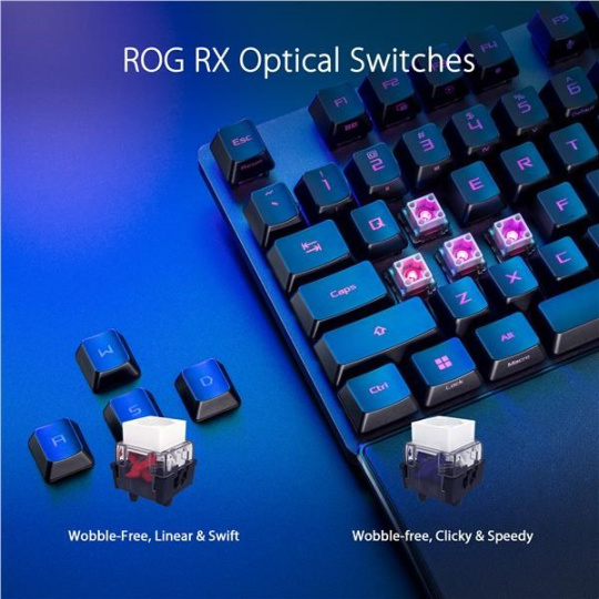 - Mechanické spínače ROG NX Snow & Storm: Předem namazané lineární spínače NX Snow a klikové spínače ROG NX Storm se stěnovým designem stopky pro zvýšení stability úhozu a vyladěné pro skvělou akustiku