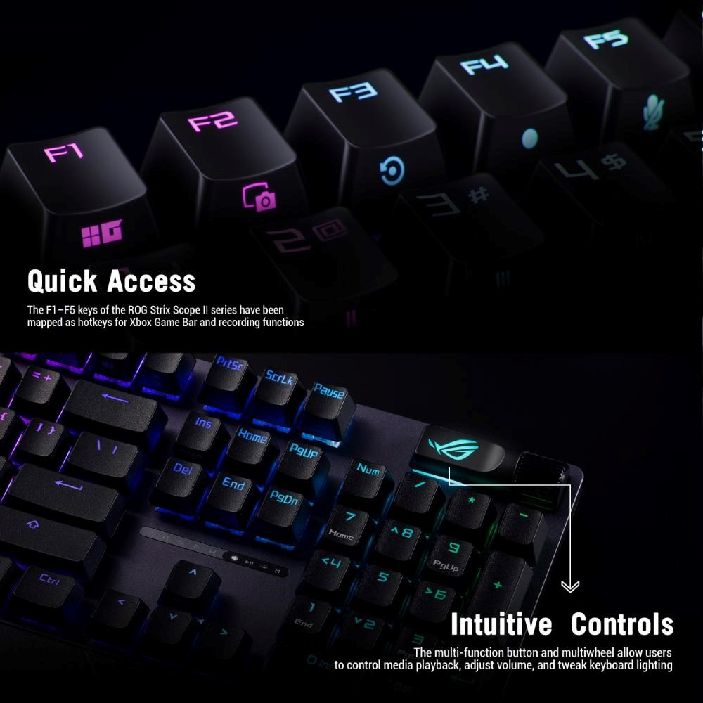 Herní klávesnice ROG Strix Scope II X s mechanickými spínači ROG NX V2 s možností výměny za provozu, pěnovým tlumením zvuku, zdvojenými klávesami PBT nebo ABS s UV povlakem, streamovacími klávesami, multifunkčními ovládacími prvky, třemi úhly sklonu a opěrkou zápěstí.