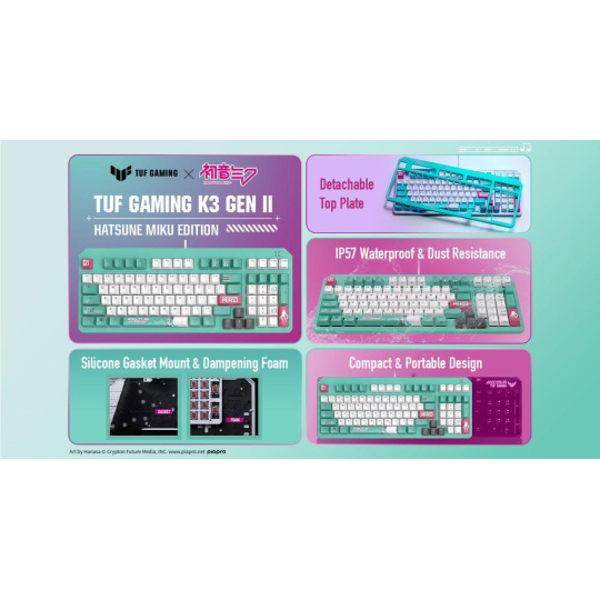 Klávesnice ASUS TUF Gaming K3 Gen II Hatsune Miku Edition s kompaktním rozložením 97 kláves, opticko-mechanickými spínači RGB, silikonovým těsněním, tlumicí pěnou, voděodolností IP57, odnímatelnou horní deskou a kompatibilitou s technologií Aura Sync.