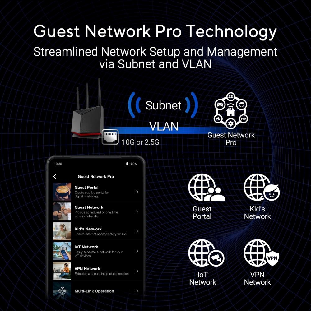 | Zabezpečení | AiProtection VPN WPA3 Personal, WPA2 Personal, WPA Personal, WPA Enterprise, WPA2 Enterprise, WPA3 Enterprise, Open System & OWE WPS Let's Encrypt DNS-over-TLS SSH Bezpečnostní skenování Firewall - Maximální filtr klíčových slov brány firewall : 64 - Maximální filtr síťových služeb brány firewall : 32 - Maximální filtr URL brány firewall : 64 |