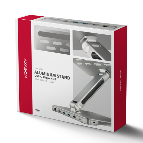 AXAGON HMC-STND 7in1 Hub & Stand je jedinečný multifunkční hub integrovaný do stojanu pro notebook nebo tablet. Tento hub rozšíří Váš notebook nebo tablet o dalších šest portů. Váš notebook připojíte k hubu přes USB-C USB-C kabel dlouhý 60 cm. Okamžitě tak máte k dispozici připojení pro monitor, tři USB zařízení, konektor RJ-45 pro Gigabitovou ethernet síť a napájení notebooku pomocí technologie Power Delivery. Stojan s dvěma klouby zlepšuje ergonomii a pohodlí při práci a je vhodný pro zařízení od 10" do 16". Je ideální jako dokovací stanice 7v1 pro Windows notebooky i Apple MacBook Air nebo MacBook Pro.
