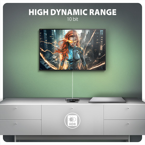 • Podpora HDR (High dynamic range, 10 bit support) - realistická reprodukce světlých a tmavých detailů.