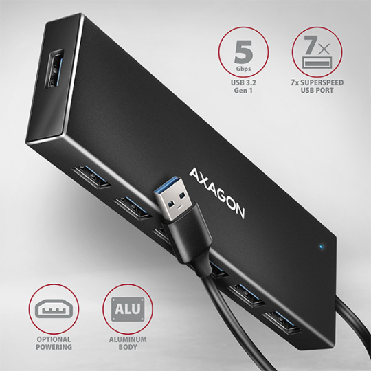 AXAGON HUE-F7A, 7x USB 3.2 Gen 1 ALU FLAT CHARGING hub, micro USB napájecí konektor, kabel USB-A 1m