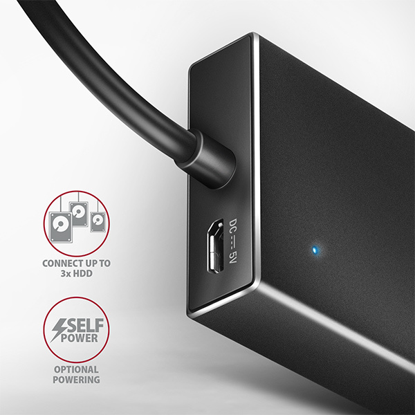 Všestrannost tohoto USB hubu zvyšuje vestavěný micro USB konektor pro dodatečné napájení ze standardních USB nabíječek dodávaných k mobilním telefonům. Díky tomuto přídavnému napájení lze například připojit ještě více externích disků k počítači nebo zvýšit počet nabíjených mobilních telefonů. Zvládne trvalé připojení několika externích disků i bez externího napájení hubu. Po připojení externího napájení lze pracovat i s pěti externími disky současně.