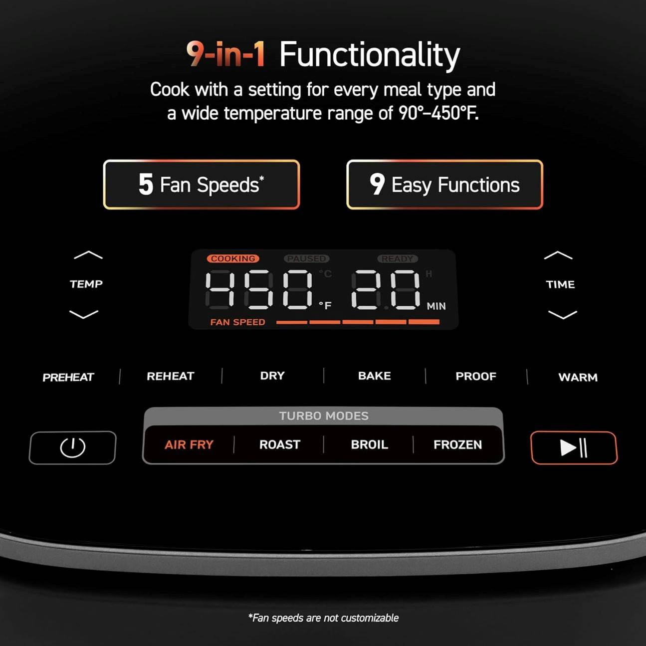 - 9 funkcí: fritování, pečení, grilování, dušení, sušení ovoce nebo zeleniny, rozmrazování, ohřívání nebo udržování teploty