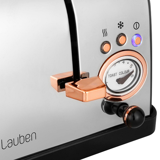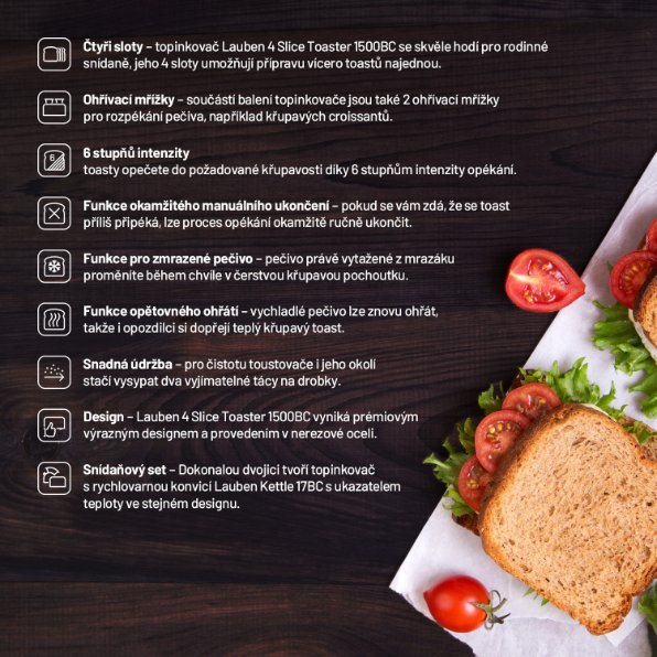 Pro dokonalou rodinou snídaniZpříjemněte si začátek dne výtečnou rodinou snídaní. Už žádné hádky o první křupavý toast. Díky Lauben 4 Slice Toaster 1500BC připravíte snídani až pro čtyři osoby najednou, přesně tolik chlebů do topinkovače naráz vložíte a na dvou přiložených ohřívacích mřížkách rozpečete další pečivo. Zvolit můžete z 6 stupňů intenzity opékání, dále je k dispozici funkce pro rozmrazování pečiva či funkce opětovného ohřátí pro případ, že pečivo vychladne. Pokud se vám zdá, že se toast připéká, stačí využít funkce okamžitého manuálního ukončení opékání. Přístroj se snadno udržuje, stačí vyjmout tác na drobky a vysypat. Prémiový design z nerezové oceli nenaruší ani kabel, který snadno ukryjete do dna základny. Toaster navíc vytváří dokonale stylový snídaňový set spolu s rychlovarnou konvicí Lauben Kettle 17BC.