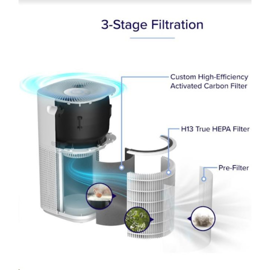 Druhou vrstvou je HEPA filtr H13. To odlišuje Levoit od konkurence, protože filtr HEPA H13 je mnohem kvalitnější a spolehlivější než běžně používané HEPA H11. Zde se odfiltrují jemné prachové částice, plíseň, bakterie, pyl, kouřové částice, roztoče a srst.