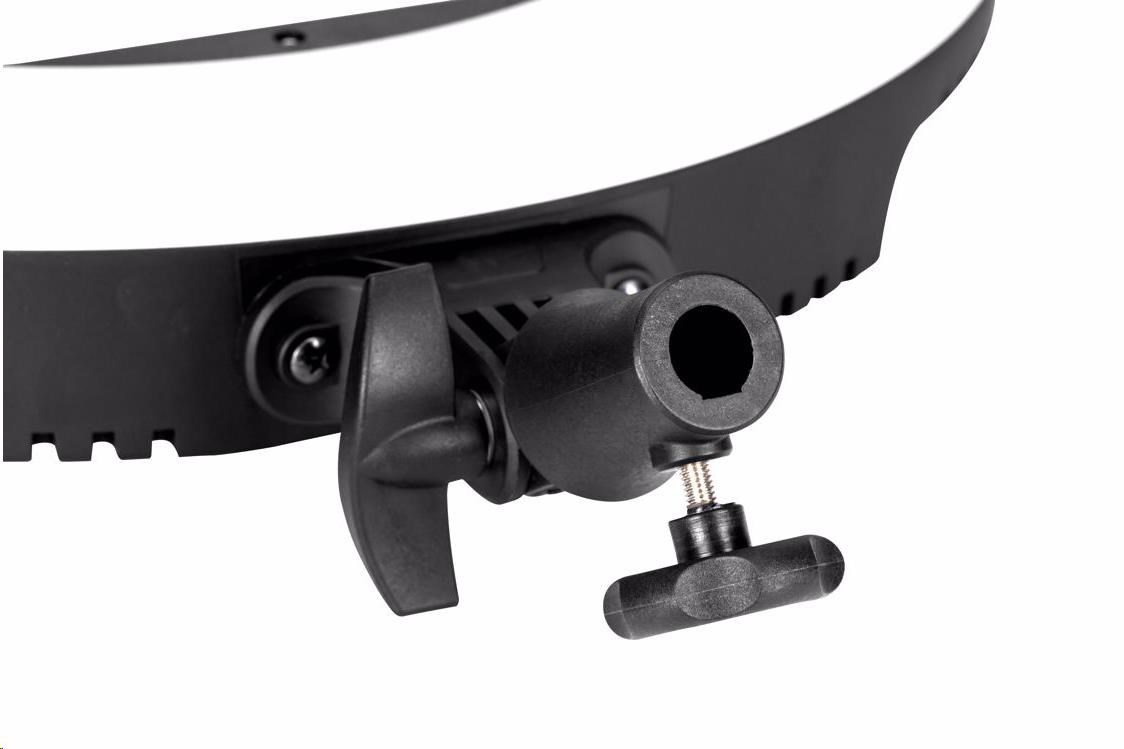LED kruhové světlo Halo 18 lze napájet dodávaným AC adaptérem. Díky standardnímu 5/8" závitu může být kruhové světlo upevněno na téměř jakýkoli světelný stativ (není součástí dodávky). Tato sada zahrnuje řadu příslušenství včetně držáku na mobilní telefon a oboustranného make-up zrcátka, z nichž jedno z nich lze upevnit přímo do středu kruhového světla.
