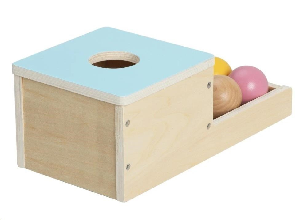 Dřevěný box (bedýnka) s dřevěnými koulemi seznámí miminko s vlastnostmi objektů (předmětů), v tomto případě dřevěných koulí. 3 dřevěné koule v přírodním provedení a v jemných pastelových barvách mizí v dřevěném domečku (boxu), aby se pak dveřmi vykutálely do dřevěné zahrádky (ohrádky). Tuto záhadu musí každé dítko vyřešit a tak bude tuto zábavnou činnost opakovat znovu a znovu. Při opakované hře děti zdokonalují své dovednosti, zabaví se a užijí si spoustu legrace.