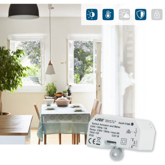 Programovatelný bezdrátový Spínací akční člen s měřením (HmIP-FSM) pro skrytou montáž, napájený ze sítě 230 V, je součástí systému chytré domácnosti Homematic IP.