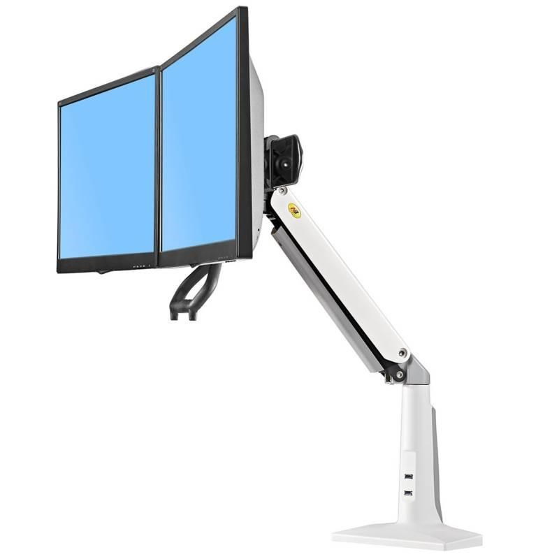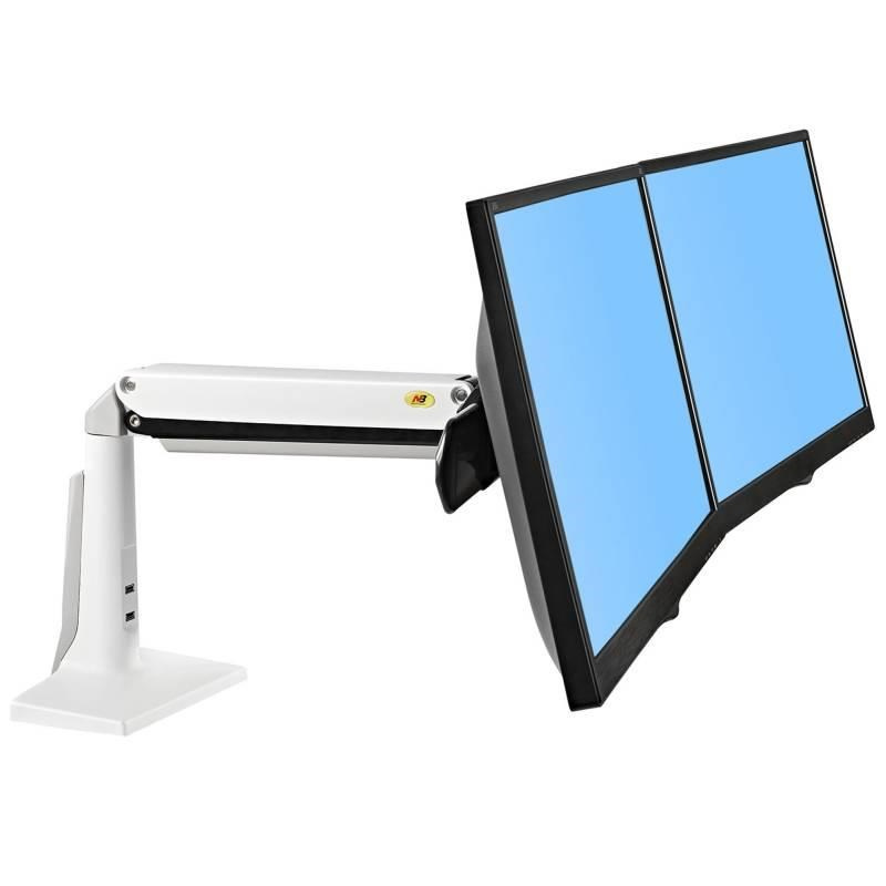 Stolní držák na 2 monitory NB F27W Profesionální stolní držák na 2 monitory 19-27", otočný +/-180°, sklopný +16°/-10°, nastavení výšky 120-600mm, vzdálenost od úchytu dle natočení 0-628mm, 2x port USB 3.0, 2 typy stolních úchytů, systém vedení kabeláže, VESA 75x75 a 100x100, nosnost 12kg, bílé provedení Držák v bílém provedení pro zavěšení dvou monitorů vedle sebe, profesionální kvality a moderního designu. Ideální pomocník, pokud potřebujete dát 2 monitory na stolní držák vedle sebe, ať už do roviny nebo do paraboly. Držák je plně nastavitelný - otočný, sklopný, výškově polohovatelný, funkce PIVOT pro natočení monitorů do horizontální nebo vertikální polohy. Pod monitory je madlo pro velmi snadné polohování jednou rukou - kdykoliv ihned změníte polohu monitorů snadno, rychle a bez použití jakéhokoliv nářadí. Držák je možné uchytit na stolové desky nebo jakékoliv vodorovné plochy o síle 10mm až 95mm, uchycení je možné buď na okraj (2 svorky) nebo kamkoliv do prostoru (nutný otvor 10-50mm). Rameno držáku má systém pro skryté vedení kabeláže, na stolním úchytu jsou navíc 2 porty USB 3.0 Nastavitelný držák na dva monitory 19-27 palců, umístění vedle sebe do paraboly nebo roviny, plně polohovatelný snadno jednou rukou - NB F27W Technické údaje: zatížení 6kg až 12kg (hmotnost 1 monitoru 3-6kg) ideální pro zavěšení 2 monitorů s úhlopříčkou 19" až 27" držák podporuje VESA standardy pro uchycení monitorů 75x75 a 100x100 plně polohovatelný, snadná změna polohy jednou rukou pomocí madla otáčení do stran +/- 180° naklápění nahoru až 16°, dolů až 10° fukce PIVOT - možnost otočení každého monitoru z horizontální do vertikální polohy a zpět vzdálenost od úchytu max. 628mm výškové polohování 120mm až 600mm monitory jsou vedle sebe v mírné parabole úchyty monitorů jsou posuvné, monitory mohou být úplně u sebe (bez mezery) nebo s mezerou madlo pro snadnou změnu polohy držáku (je odnímatelné, pokud ho tam nechcete) maximální vzdálenost mezi středy monitorů 700mm vestavěné 2 porty USB 3.0 ve stolním úchytu systém pro skryté vedení kabeláže ramenem držáku výškové polohování zajišťuje plynová pružina s nastavitelnou tuhostí uchycení na stoly nebo vodorovné povrchy o síle 10mm až 95mm uchycení na okraj desky (2 svorky) nebo do prostoru (nutný otvor o průměru 10mm až 50mm) profesionální zpracování TOP kvalita barevné provedení bílé záruka 3 roky Bílý držák na dva monitory NB F27W Držák podporuje VESA standardy pro uchycení monitorů s VESA: VESA 75x75 VESA 100x100 Profesionální držák nejvyšší kvality s možností okamžité změny polohy monitorů bez použití nářadí, snadno, rychle pouze jednou rukou. Krásný design v bílém provedení, systém pro ukryté vedení kabeláže, integrované 2 porty USB 3.0.