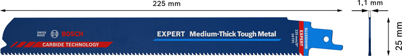 Vydrží až 50× déle při řezání odolných materiálů než pilový list Bosch S1122BF - Instalatéři, renovátoři a demoliční pracovníci vědí, že řezání ocelových trubek a profilů je náročný úkol dokonce i s výkonnou pilou ocaskou. Středně silný kov může při řezání velmi vibrovat. Pilový list EXPERT Medium-Thick Tough Metal tyto kovy řeže nejen efektivně a s minimálními vibracemi, ale nabízí také výjimečnou životnost. List s technologií Bosch Carbide Technology má velmi vysokou odolnost. Pilový list do pily ocasky Bosch EXPERT Medium-Thick Tough Metal je náš specialista na ocel střední tloušťky – jeho karbidové zuby mají jemnější rozteč než jeho protějšek pro silný kov. To znamená, že jednotlivé zuby se při řezání slabšího plechu ani středně silných trubek nezachytávají. Specializovaný technicky vyspělý list, usnadňuje práci, pro kterou je navržen. Pilové list do pily ocasky Bosch EXPERT Medium-Thick Tough Metal ocení každý řemeslník, který pravidelně pracuje se středně silnými ocelovými materiály. Kompatibilní se všemi pilami ocaskami s upínáním pro stopku S.