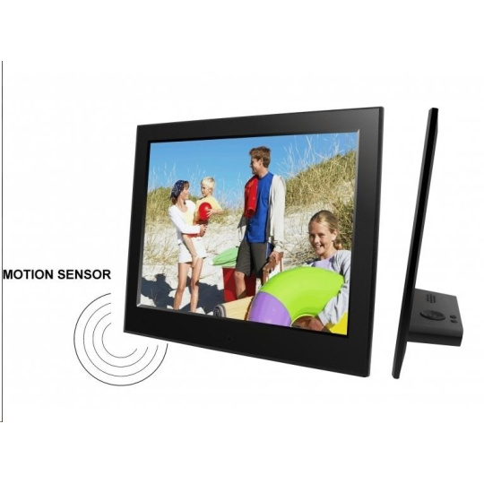 Digitální fotorámeček s úhlopříčkou 8", ultratenký 6,5 mm s opěrkou, vysoké rozlišení 1280x800px, 16:10, Motion Senzor pohybu, prohlížení obrázků ve formátu JPEG, poslech hudby MP3/WMA a přehrávání videa Full HD MPEG1/2/4, multislot SD/MS a USB2 flash max 32GB, Audio out, Auto Start/ON/OFF, funkce: SlideShow (prezentace), náhledy, zoom a otáčení obrázků, budík, hodiny, kalendář. Rozměr: 220x176x23 mm, hmotnost 440 g. Součástí dodávky síťový zdroj AC/DC 5V/1,5A, dálkové ovládání.