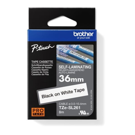 Samolaminovací páska TZe-SL261 s délkou 36 mm s černým tiskem na bílé byla vyvinutá pro dlouhodobou identifikaci síťových kabelů. Má speciální lepicí vlastnosti štítků pro trvanlivé pevné ovinutí kolem vašich vodičů a kabelů. Kompatibilní s některými modely P-touch, které používají pásky TZe 36 mm.