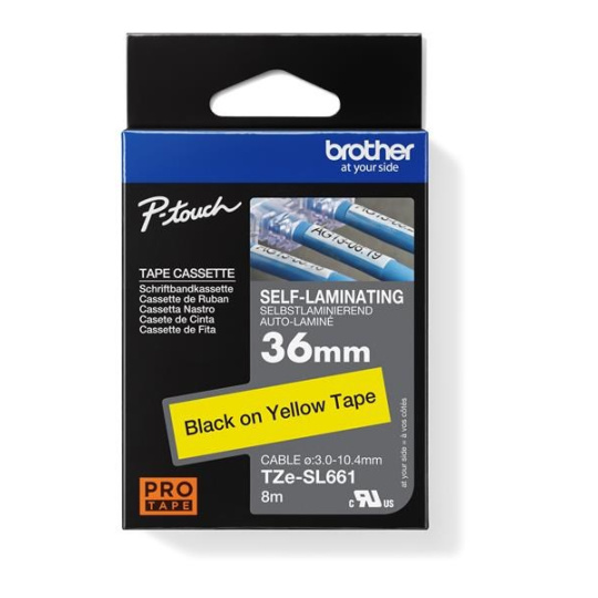 Samolaminovací páska TZe-SL661 s délkou 36 mm s černým tiskem na žluté byla vyvinutá pro dlouhodobou identifikaci síťových kabelů. Má speciální lepicí vlastnosti štítků pro trvanlivé pevné ovinutí kolem vašich vodičů a kabelů. Kompatibilní s některými modely P-touch, které používají pásky TZe 36 mm.