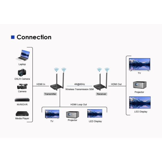- Poporuje bezdrátový přenos rozlišení 4K@60Hz a Full HD 1080p na vzdálenost až 50m