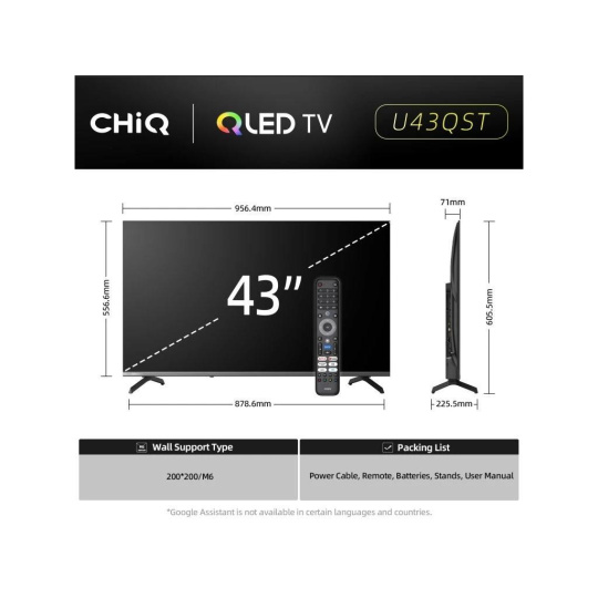 CHiQ 43“ U43QST, ultratenká metalická bezrámečková QLED Smart Google TV 5.0 s několika herními funkcemi, HDR10, HLG, obrazovkou s Ultra HD s rozlišením 3840 x 2160 pixelů, prostorovým zvukem Dolby Audio a dbx-tv.