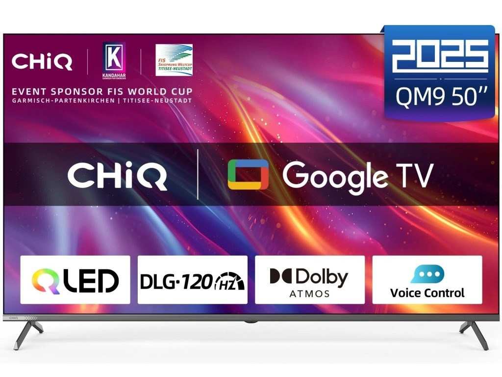 CHiQ U50QM9G, 50" (127 cm), QLED bezrámečková Smart Google TV 5.0, Ultra HD (4K), DLG 120 Hz, MEMC, Dolby Atmos, Dolby Audio, dbx-tv, HDR 10, HLG, WiFi 2,4/5G, Bluetooth 5.0, webový prohlížeč, Google Assistant, Chromecast, O2 TV, YouTube, Netflix, Prime Video, paměť 2GB+16GB, 4x HDMI, 2x USB, CI slot, 20 W, energetická třída G.